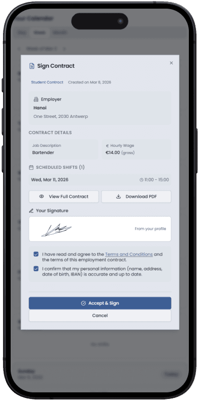 Clock in, clock out. Employees register their hours directly from their phone or tablet, while you get a complete overview of worked hours, breaks, and overtime.